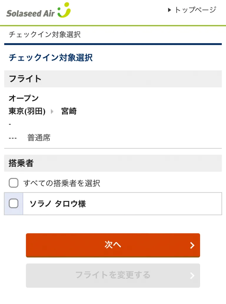 選択した便が表示されますので、確認のうえ、「次へ」をクリック(タップ)してください。