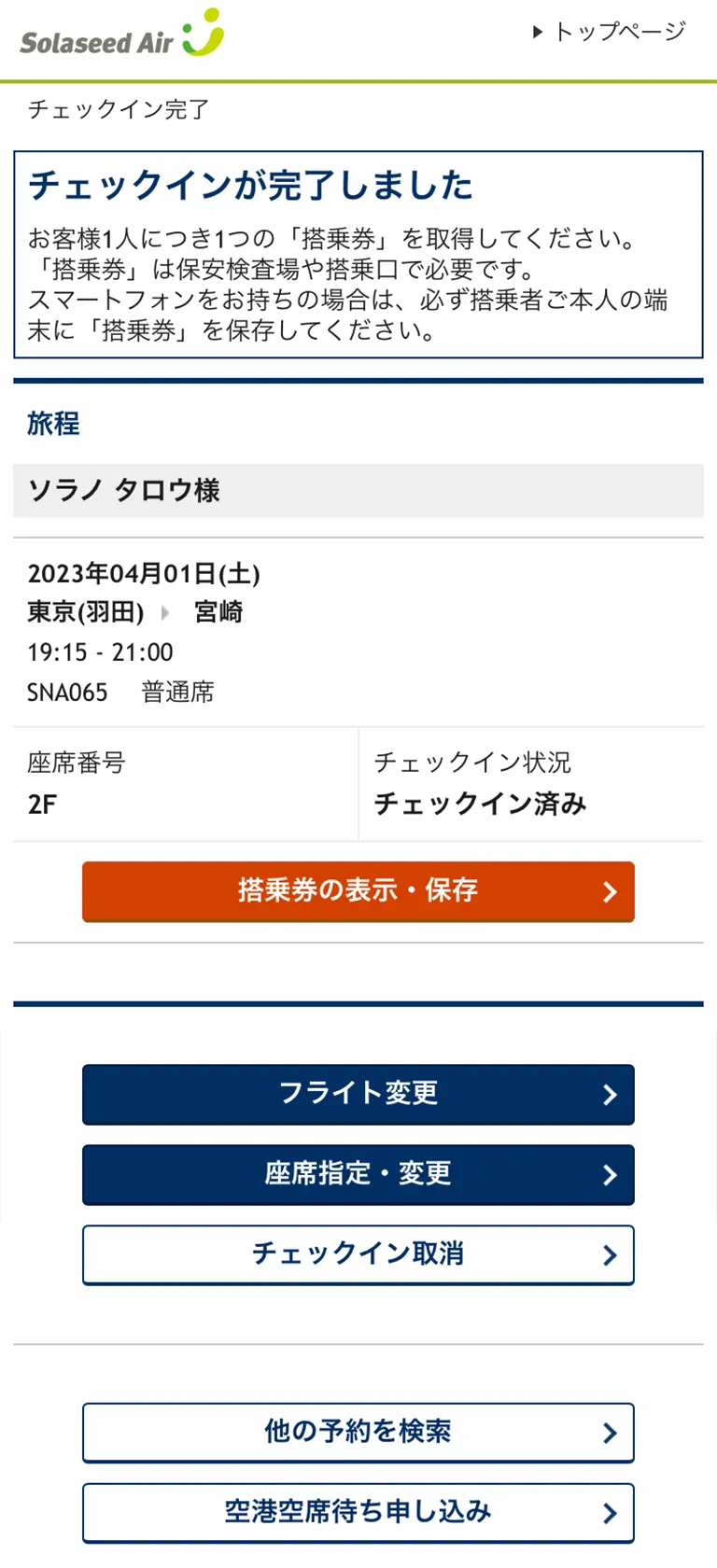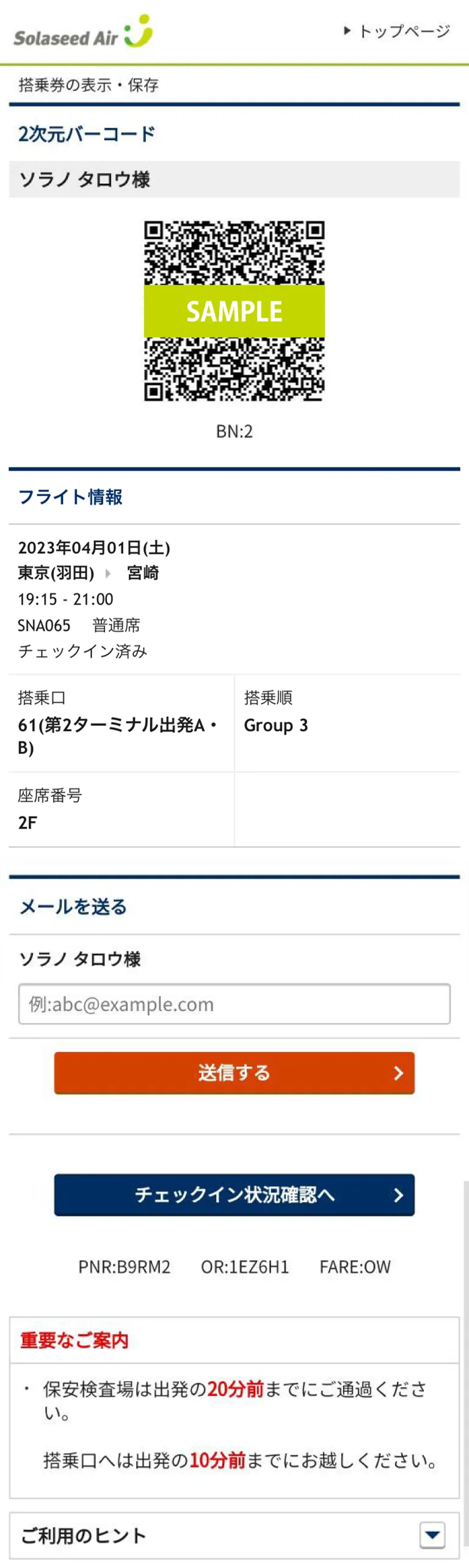 搭乗券(2次元バーコード)を印刷もしくは表示画面を保存してください。