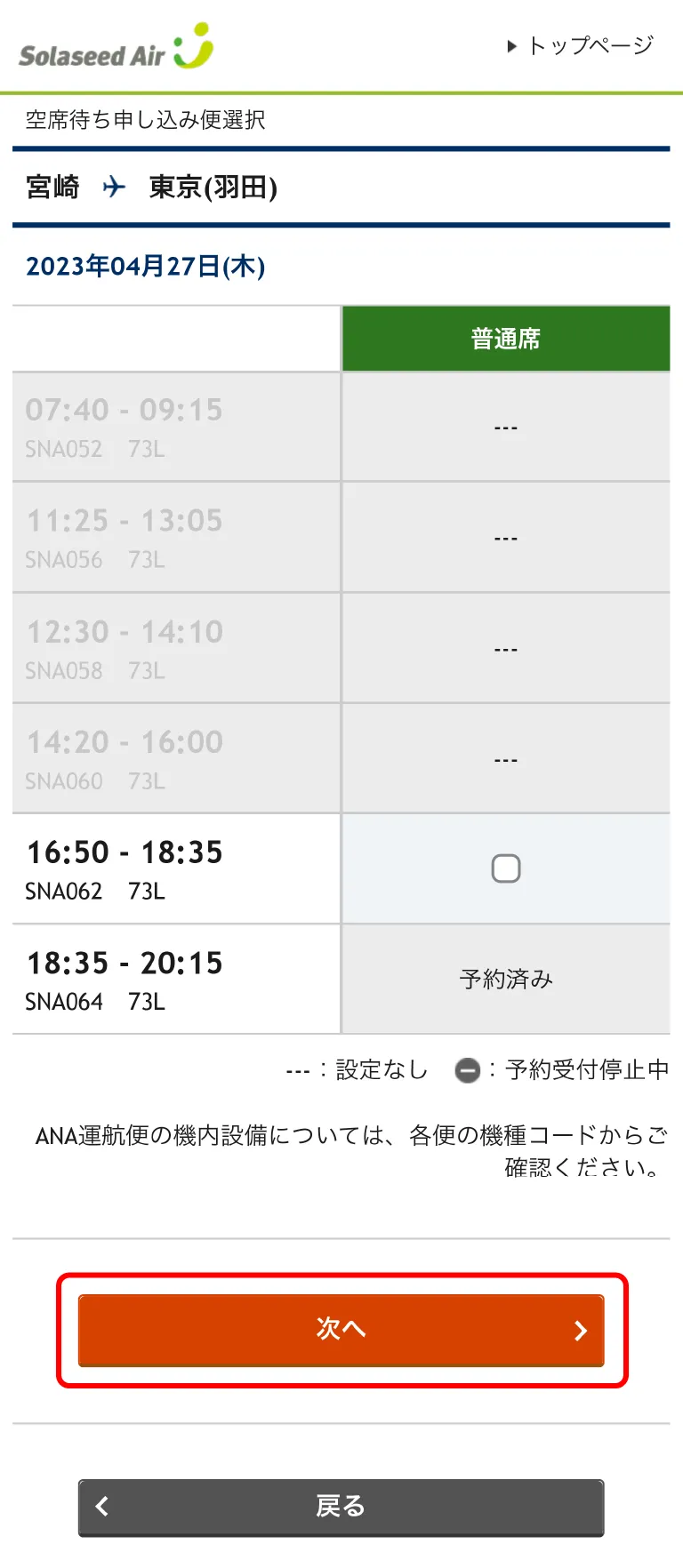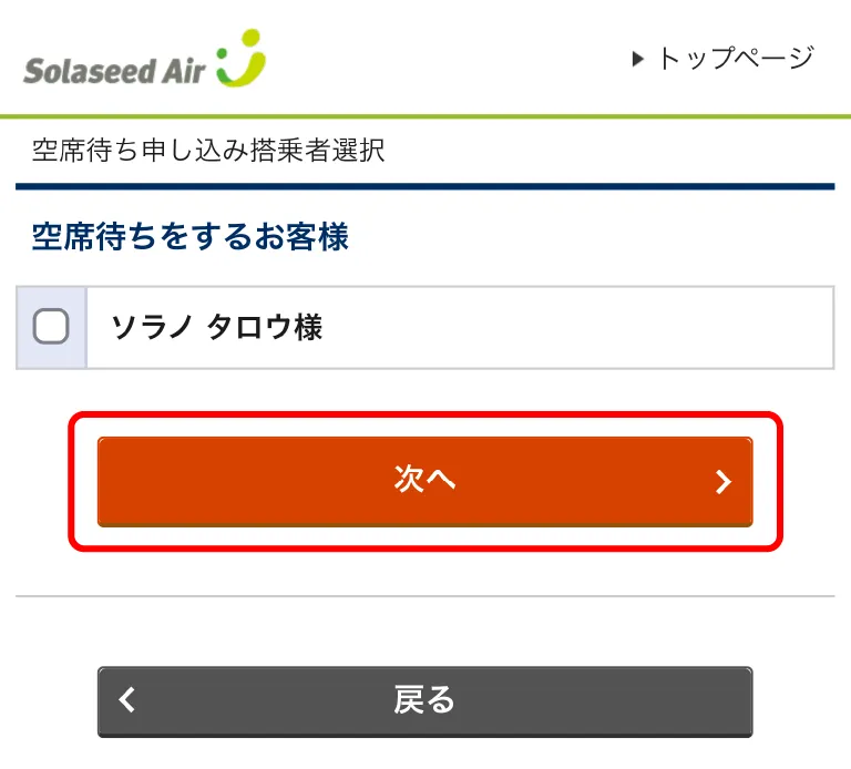 空席待ちを希望する便を選択し、「次へ」をクリック(タップ)してください。