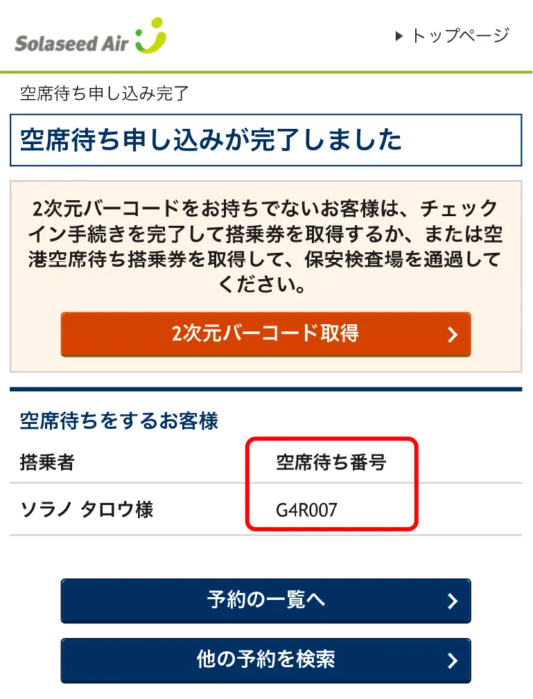 空港空席待ち番号が発行されましたら、空席待ちの申し込みは完了となります。