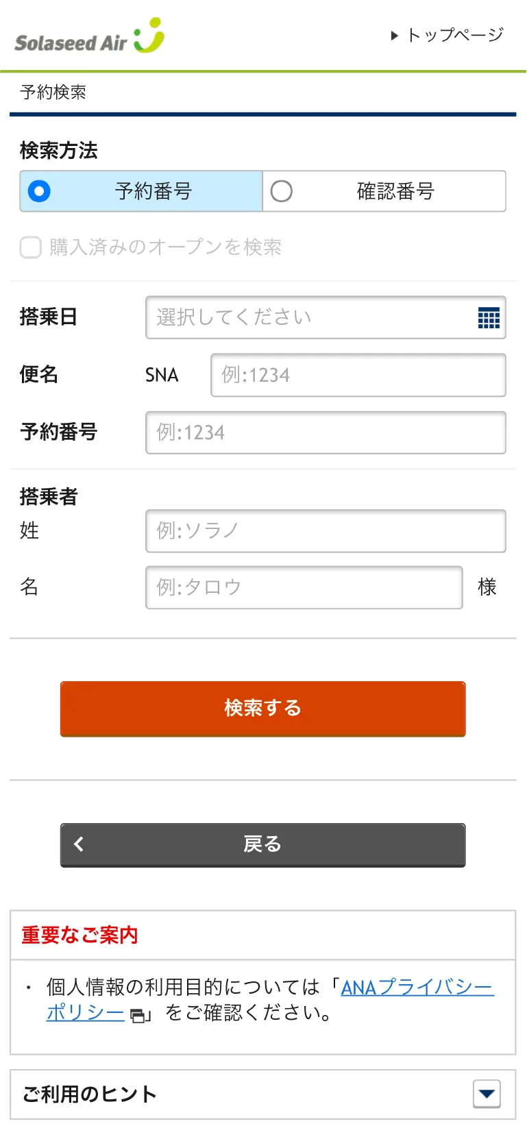 お手持ちのご予約の搭乗日・便名・氏名・予約番号もしくは確認番号