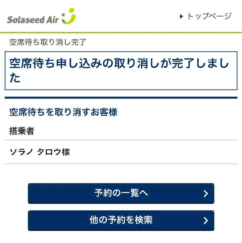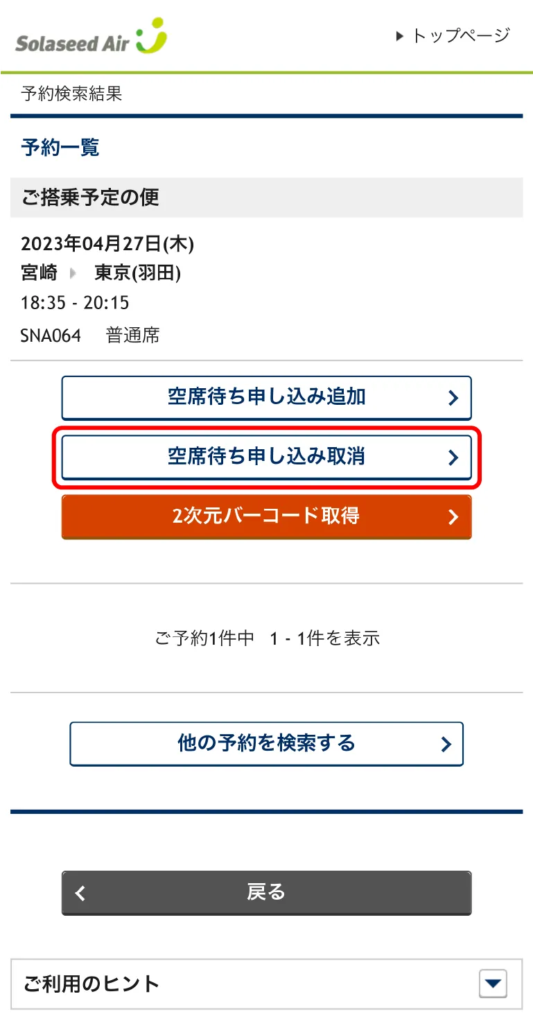 空港空席待ち申し込み時と同じ内容で予約の検索を行ってください。