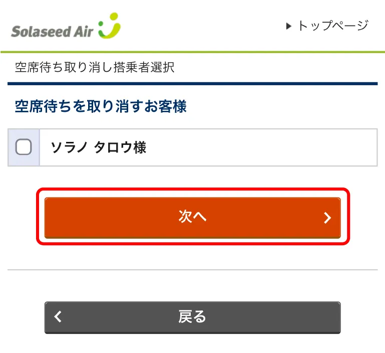 空席待ちを取り消す便を選択して、「次へ」を押してください。