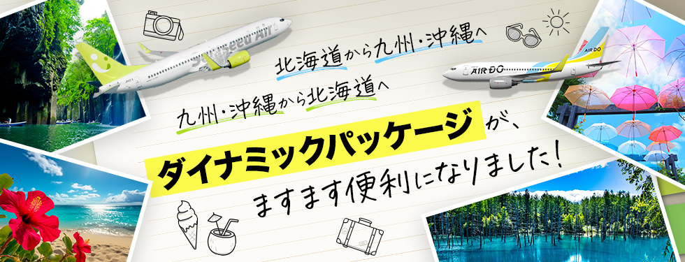 ANA X株式会社が販売する、航空券+宿泊のパッケージ商品「AIRDOダイナミックパッケージ」「ソラシド +(ぷらす)」は、ご利用いただける路線が拡大いたしました!より便利になった「航空券+宿泊」のパッケージプランで北から南まで、おトクにご旅行してみませんか?